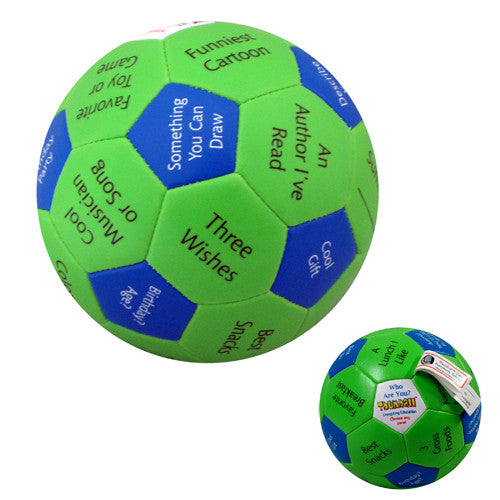 Nearly everyone enjoys playing catch and everyone can play with a ball. Game play is simple! Throw it, roll it, pass it or catch it. Look under your thumb. React to the word, phrase, or graphic found there. Each panel has a different word, graphic, or photo, and each ball has 32 panels. The Who Are You Thumball includes words and phrases such as: favorite toy or game, what makes you mad, happiest memory, etc., on each panel.